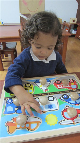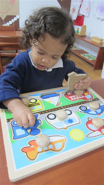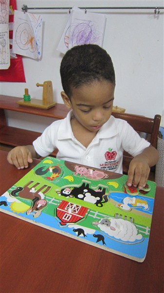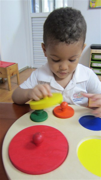 En cuanto al trabajo de los materiales, queremos resaltar que observamos a Gabriel Arturo muy laborioso, encajando los círculos de diferentes tamaños y colores, al igual que Elian, quien prefiere los rompecabezas y pudimos verlo, muy concentrado, con el de animales de la granja, así como también, buscando la pelota dentro de la caja de gaveta.