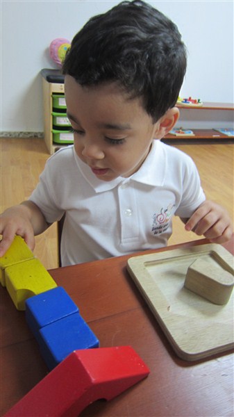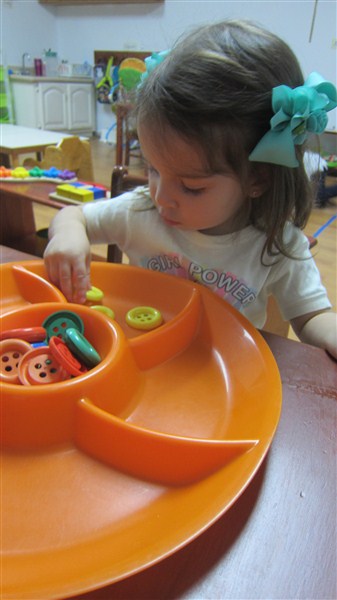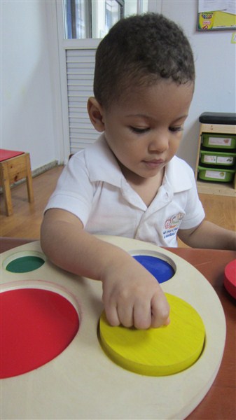 Diego Enmanuel hizo un lindo trabajo armando la casita de las figuras geométricas, mientras que Malena prefirió sortear los botones con sus diferentes colores.