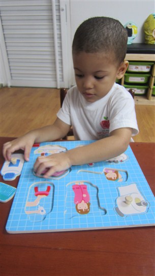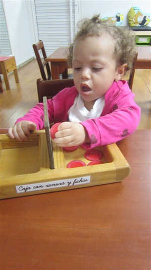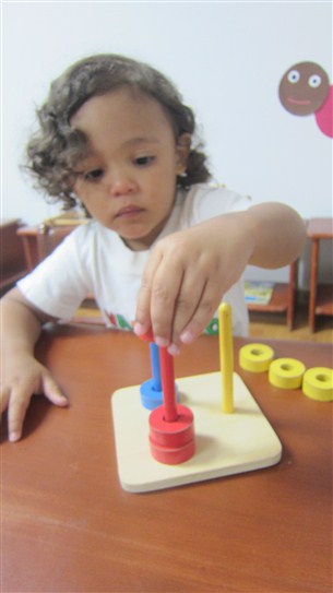 Thiago Andrés, por su parte, busco su alfombrita para trabajar con la caja de gavetas con bola y luego de recoger, lo vimos en su mesita, muy atento, con “tres discos sobre espiga”.
