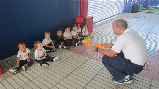 Ahora es el turno de contarles acerca de la clase de deporte de esta semana. Nuestros chicos nos sorprendieron recordando las reglas del profe Tomas y, rápidamente se sentaron en círculo a esperarlo. Luego de saludarlos, el profe les mostro los conos anaranjados y los invito a formarse para correr alrededor de ellos, como parte de los ejercicios de calentamiento.