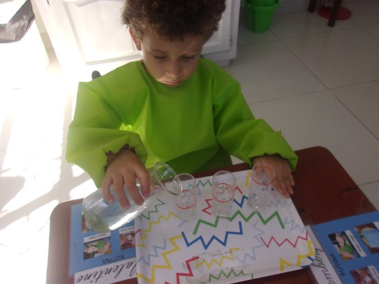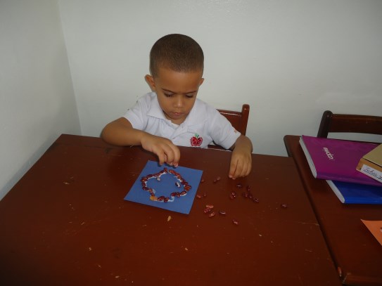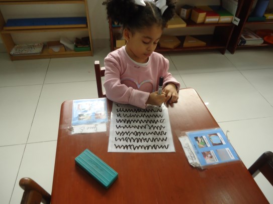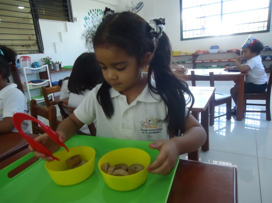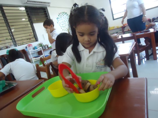 Paulette feliz toma el material de pinza y lo manipula de manera adecuada, muy concentradita trabaja su material, preparándose así en el proceso de la pre-escritura.