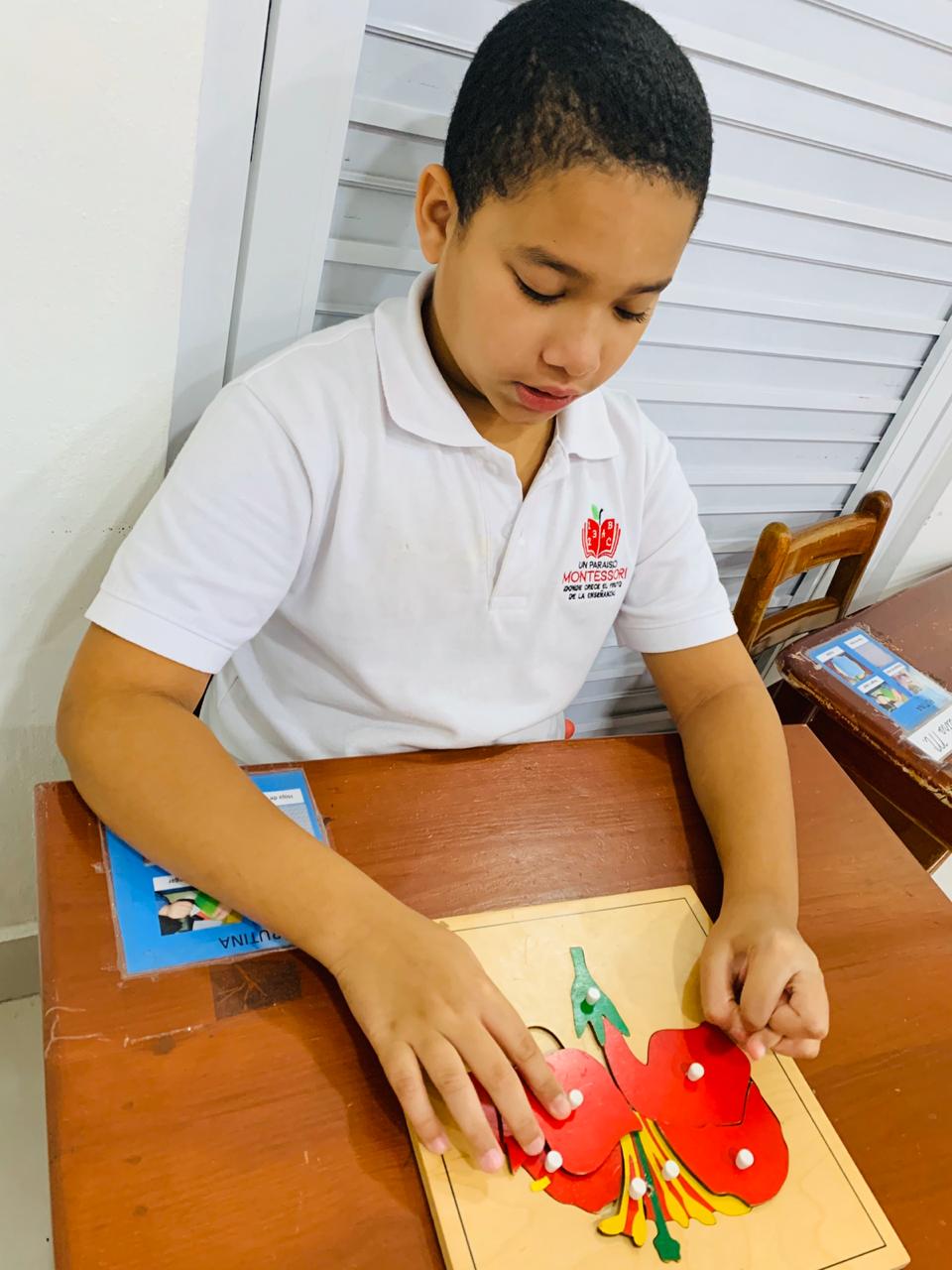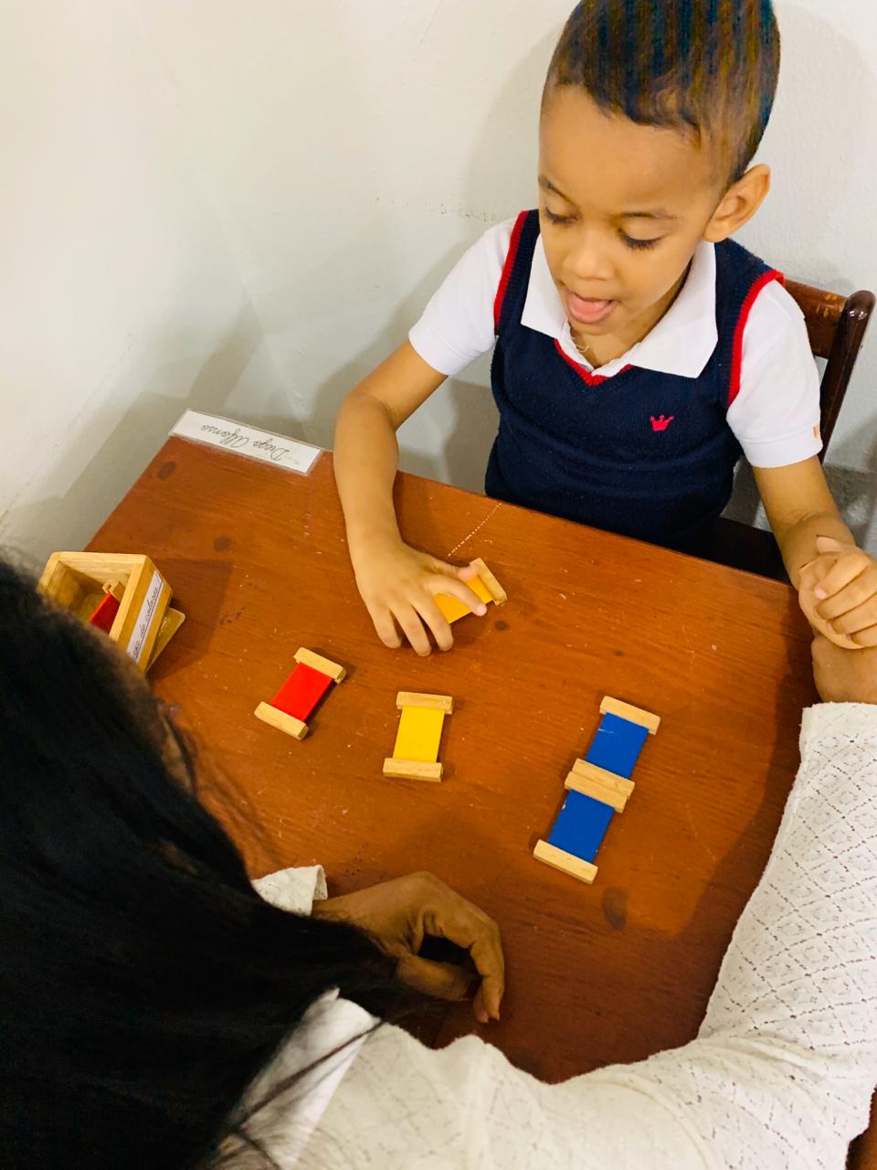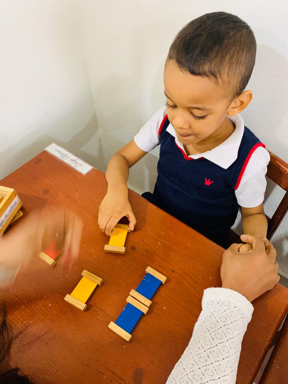 Camilo poco a poco esta manipulando mas los materiales concretos, estamos aun evaluando conocimientos y saberes, para ir partiendo a conceptos mas complejos. Llega muy contento al Centro y sube a su salón de clases con una sonrisa en su rostro, lo que denota su alegría aquí y esto es lo mas importante para nosotras, que el niño y la niña, o sea, nuestros tesoros, sean felices, todo lo demás llega por añadidura.