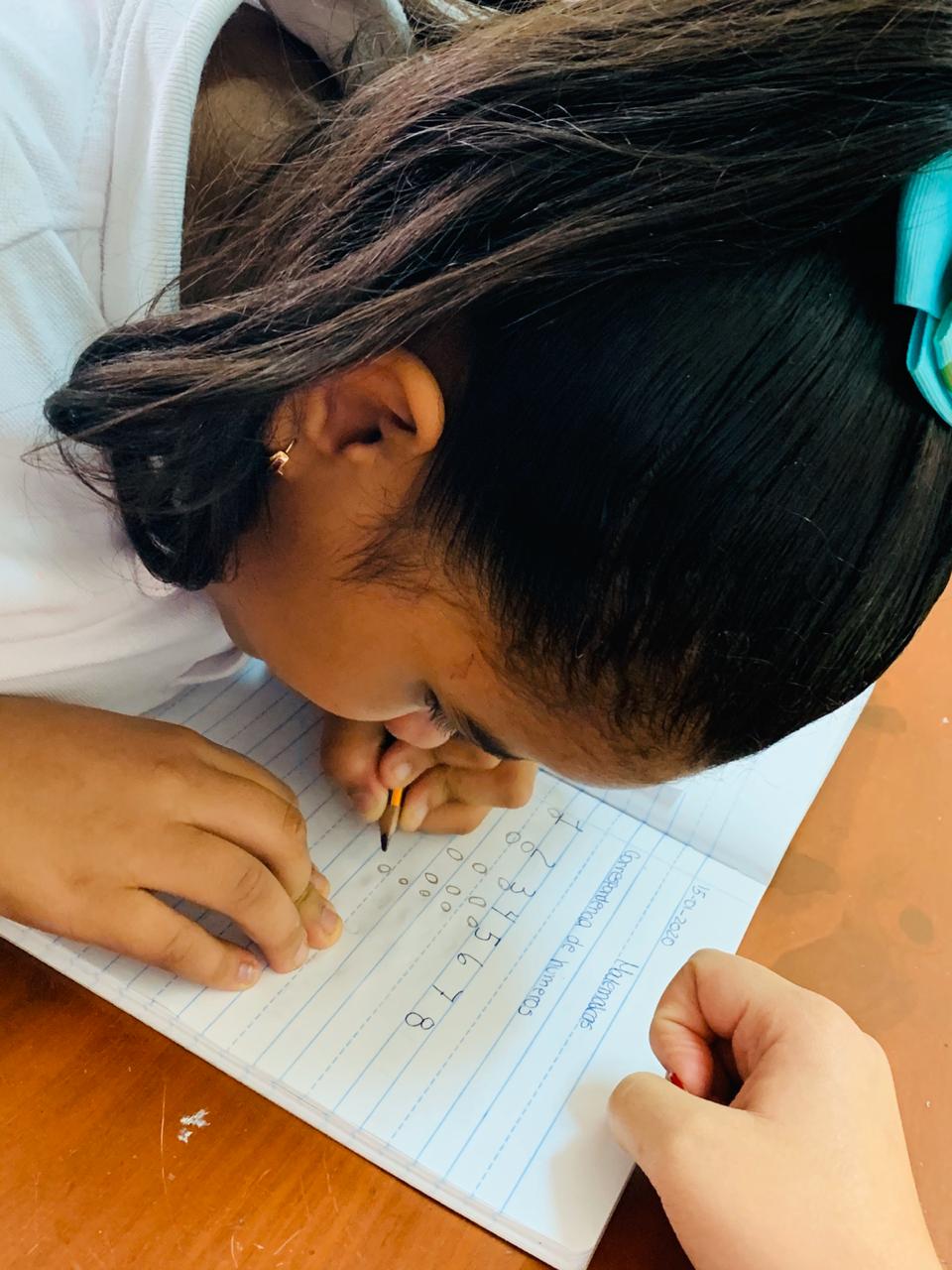 Alejandro esta mejorando mucho sus trazos, respetando cada día más los márgenes caligráficos y trazando mas pequeño. Las sumas que esta realizando ahora son verticales de una sola cifra y con la complejidad de primero entender el concepto de suma (sumar es juntar) y leyendo las sumas que realiza de manera adecuada.