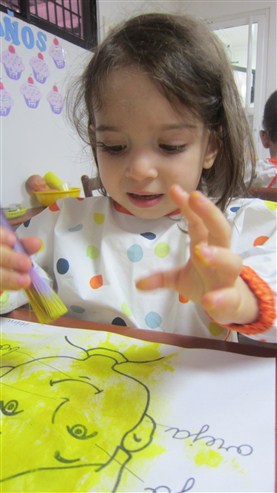 También estuvieron pintando, utilizando los pinceles gruesos y la pintura de color amarilla, rellenando una cabeza y señalando partes como los ojos, la nariz, la boca, orejas y cejas.