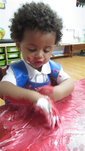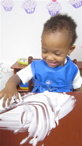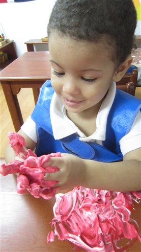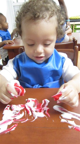 Aireen Marie empezó tocando con sus deditos la crema y cuando hizo la mezcla con la pintura, mostraba ambas manos a su maestra. Isaac tampoco perdió tiempo de participar de esta experiencia y, con mucha energía, movía sus manos y pronto, tenía toda su carita embarrada, jajajaja!!