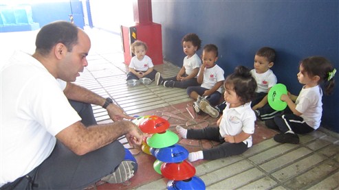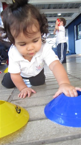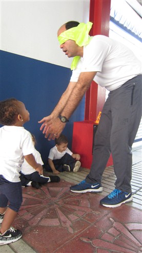 Cuando el profe le puso el pañuelo a Elian, se reía a carcajadas y se escuchaba decir a Thiago Andrés “¡aquí ta, aquí ta!”, para que fueran en su búsqueda. Más adelante, el profe los invito a jugar formando torres con unos platillos de muchos colores y, al terminar, pasaron un rato corriendo libremente detrás de ellos.