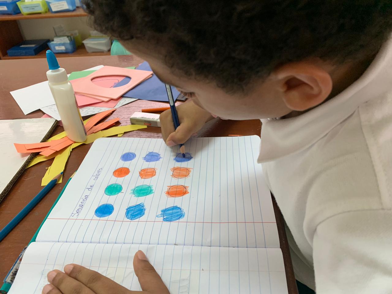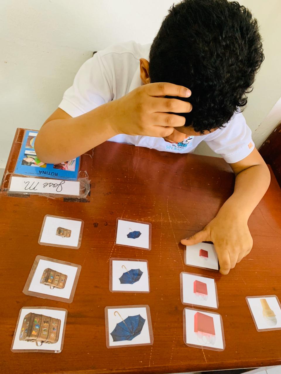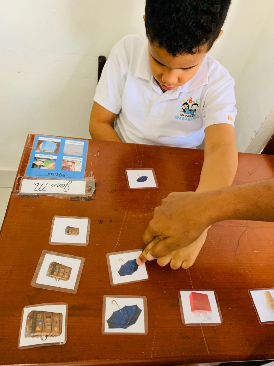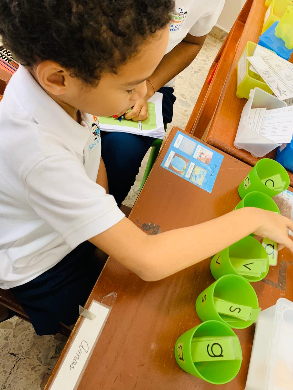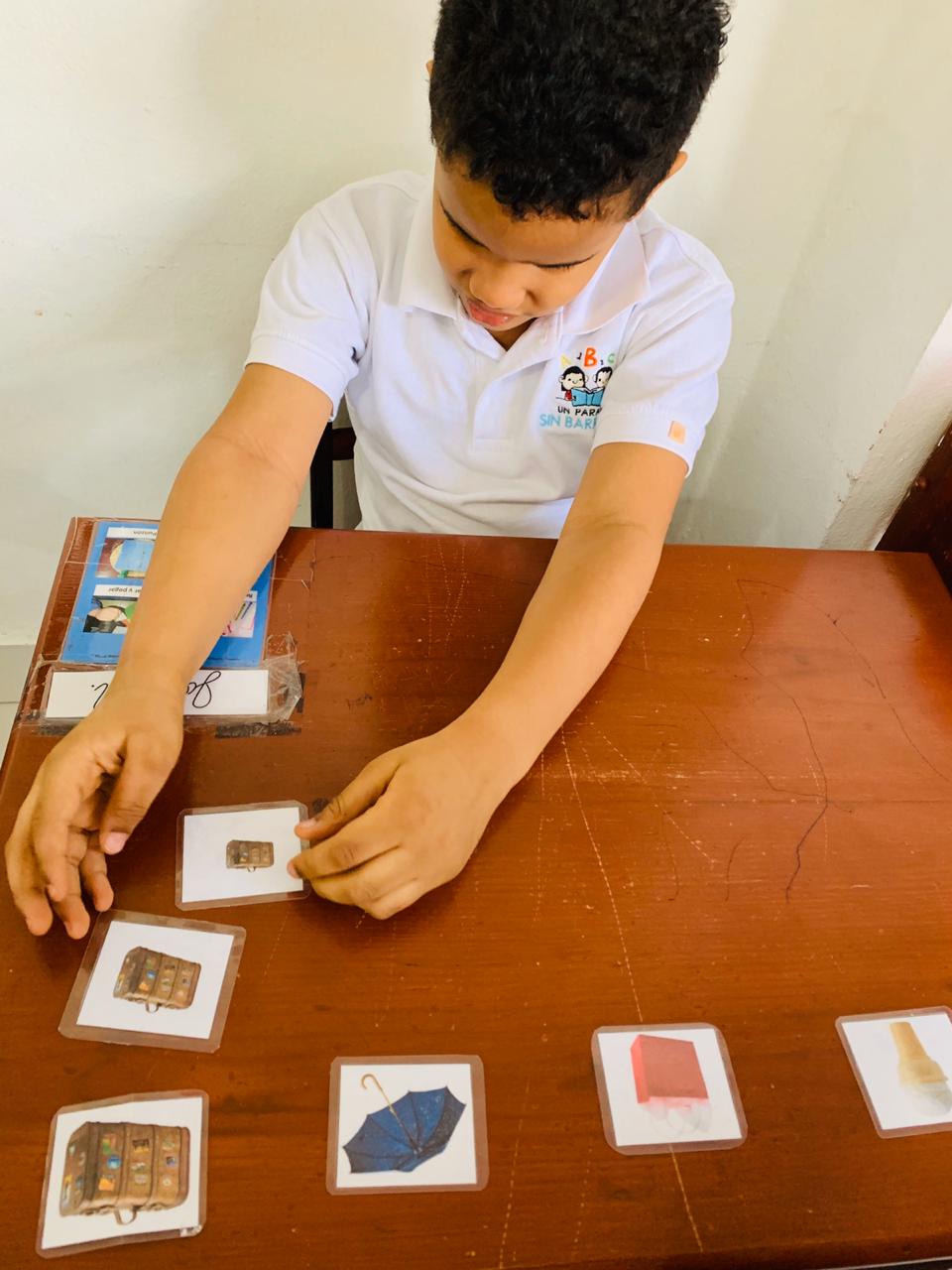 Luis Manuel paso a la nomenclatura naranja, leyendo en pizarra sus silabas y palabras simples con las uniones de estas; en este mismo orden trabaja también materiales de otros módulos como sociales y naturales, le atraen mucho también los materiales sensoriales, muy buenos para su concentración y atención.