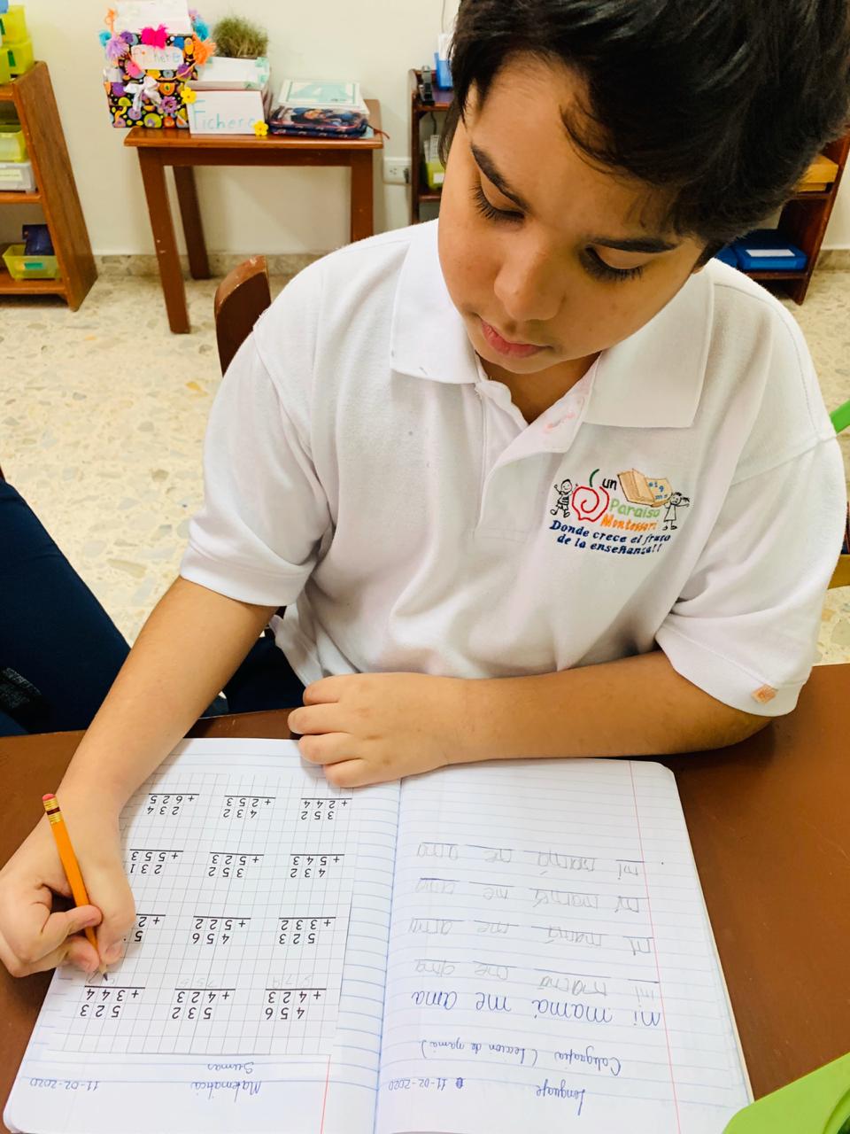 Peter sigue trabajando comprensión lectora con oraciones mas largas y sumas de dos y tres cifras.