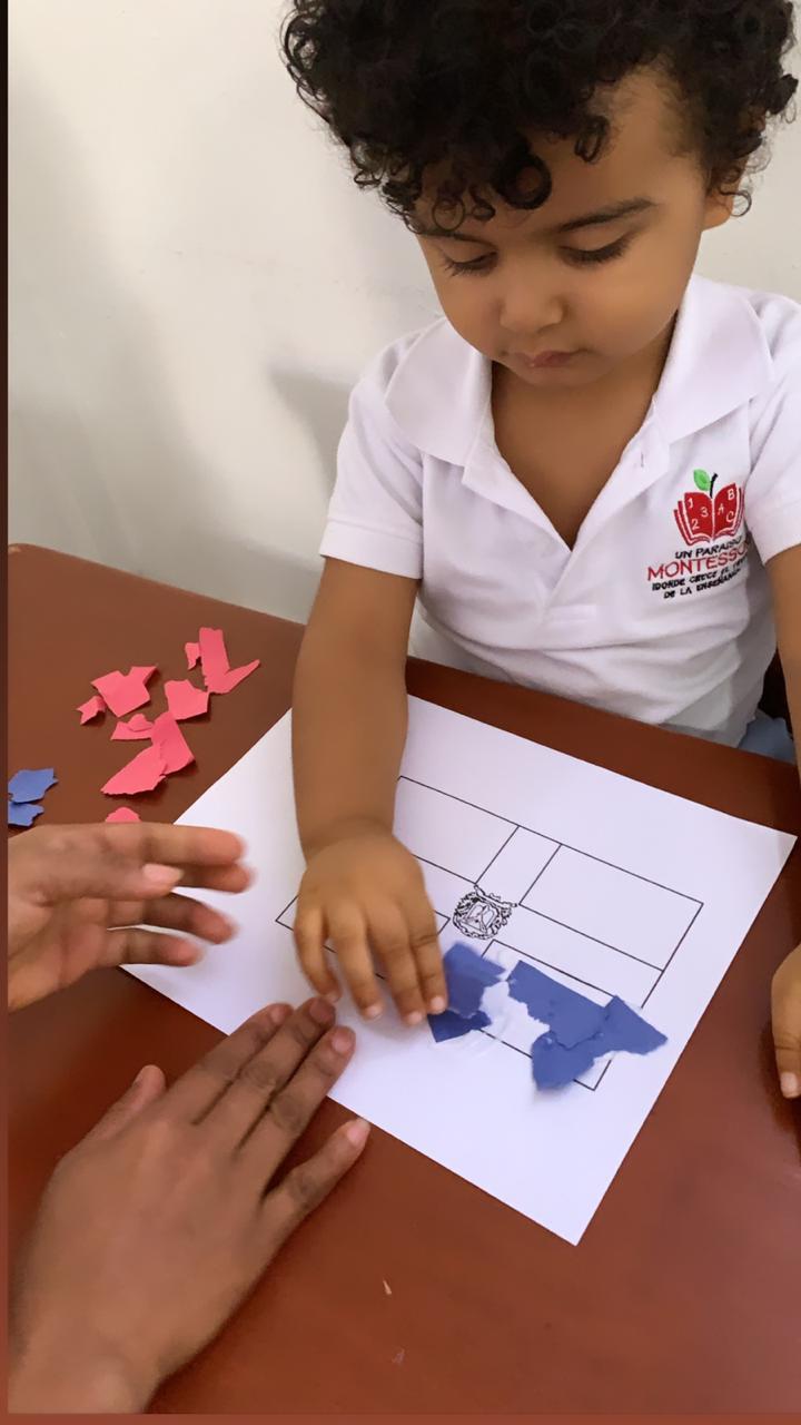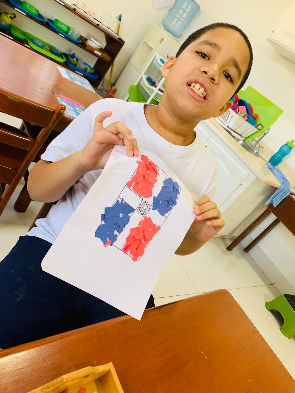 Peter estuvo encantado hoy trabajando su bandera y pegándole sus papelitos, sigue trabajando lectura comprensiva y ya realiza una hoja completa de sumas estáticas de tres cifras.